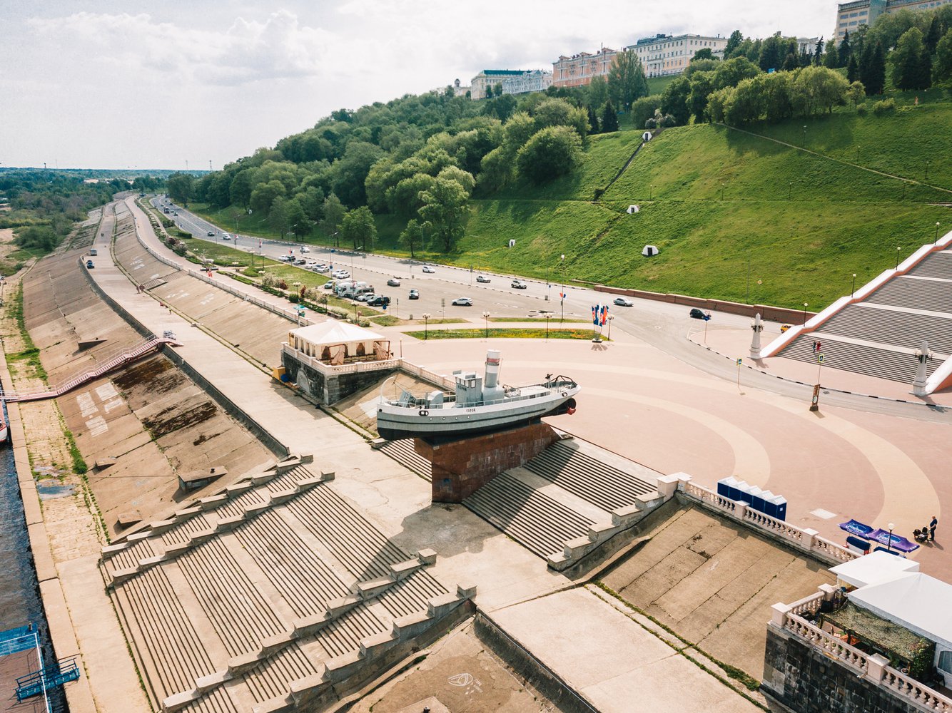 По Чкаловской лестнице спускаемся к реке. А точнее, к катеру-памятнику. У него длинная судьба – начинал жизнь в Гражданскую войну, потом – Великая Отечественная. В 1985 году водружён на постамент и стал одним из символов города. Молодожёны на счастье повязывают ленту на его винты. Ну а мы отсюда продолжим путь вдоль по Нижневолжской набережной.