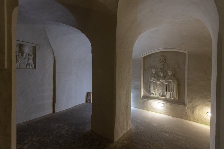А затем — спуск в прохладные кельи и коридоры, где круглый год держится температура +8°C. Блуждая по узким проходам, мы вышли к удивительной находке — керамическому иконостасу, сияющему в полумраке. Впрочем, теперь в пещерах хранится не только святыня: в одной из келий зреет местный деликатес — фермерский сыр.
